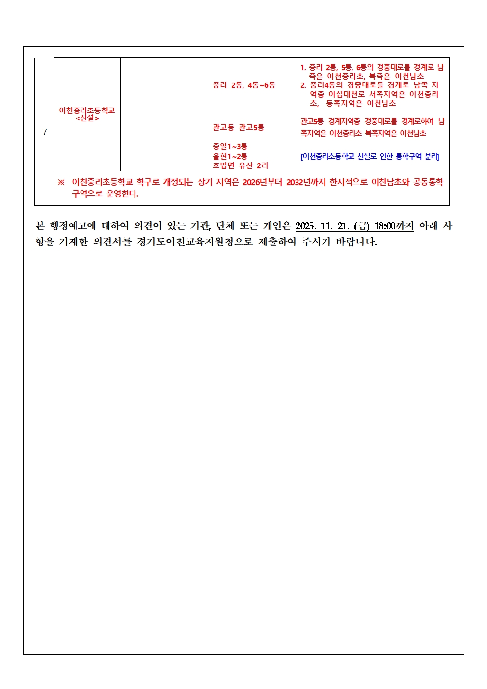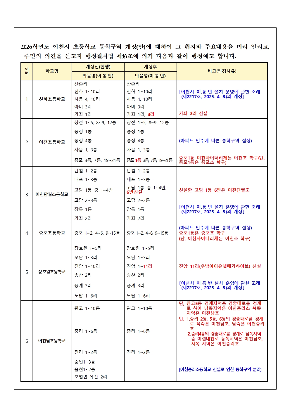 2026학년도 이천시 초등학교 통학구역 행정예고 알림