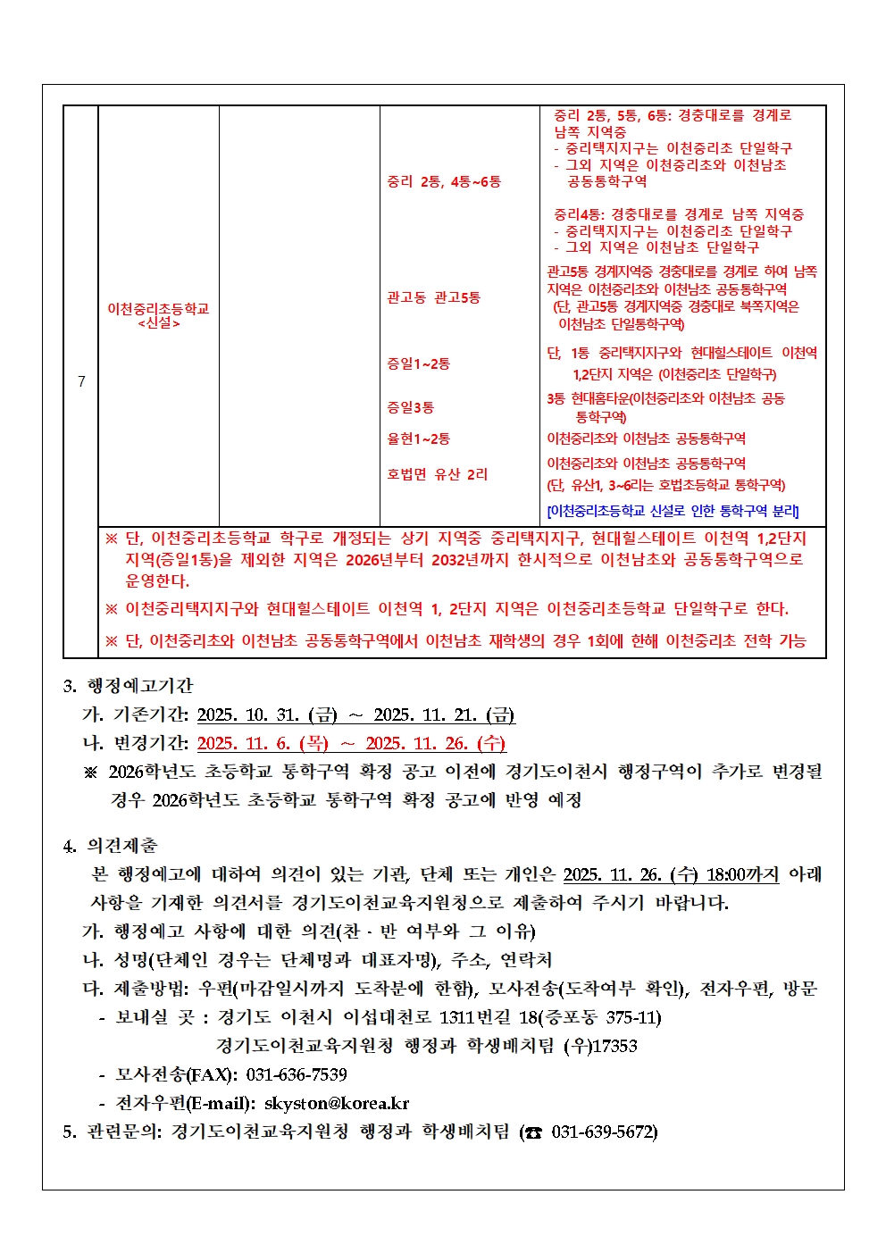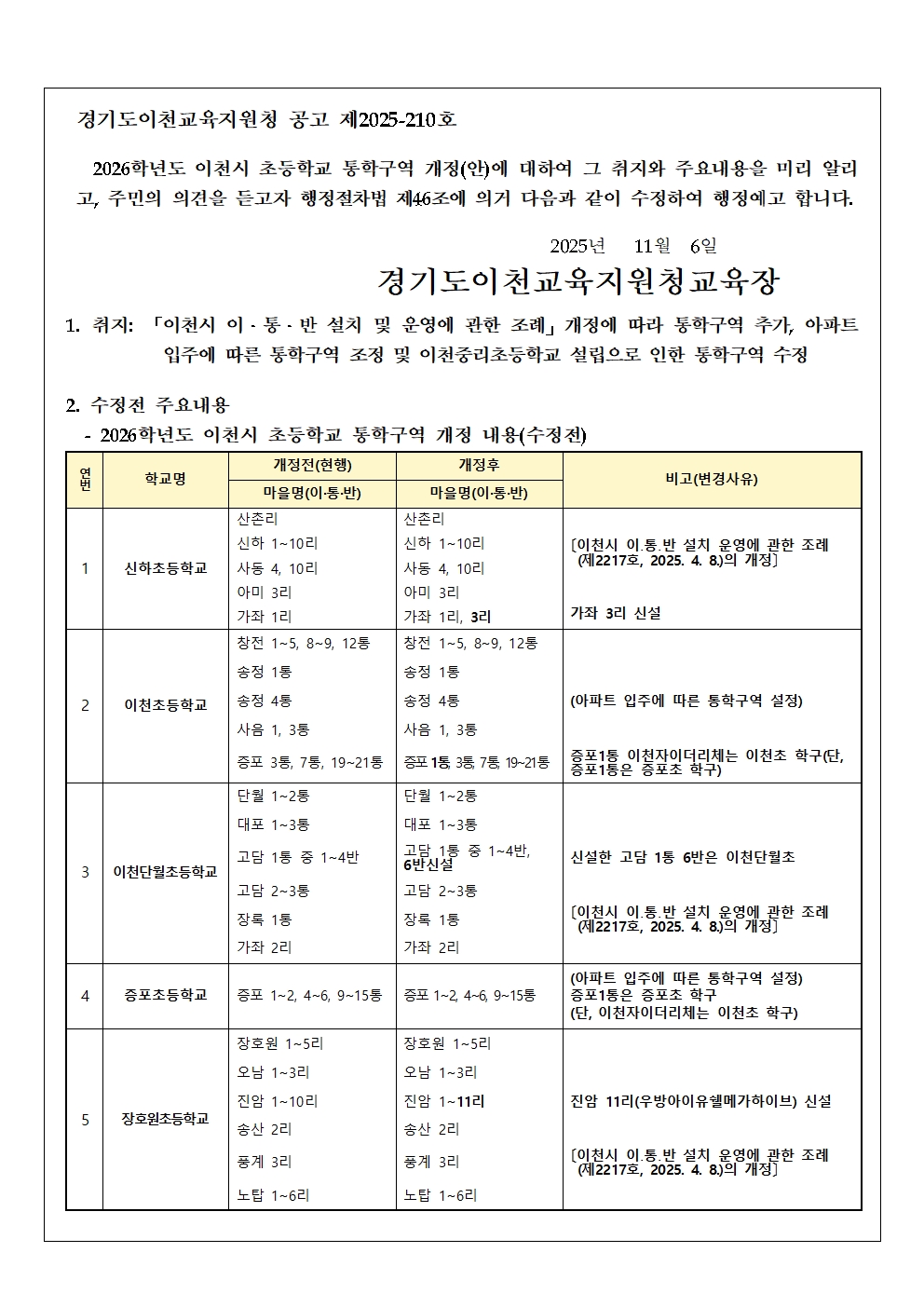 2026학년도 이천시 초등학교 통학구역 행정예고 수정(11.7.)
