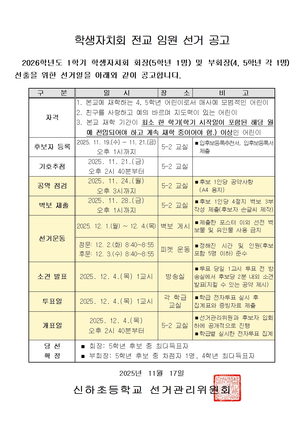 2026학년도 1학기 학생자치회 전교 임원 선거 공고