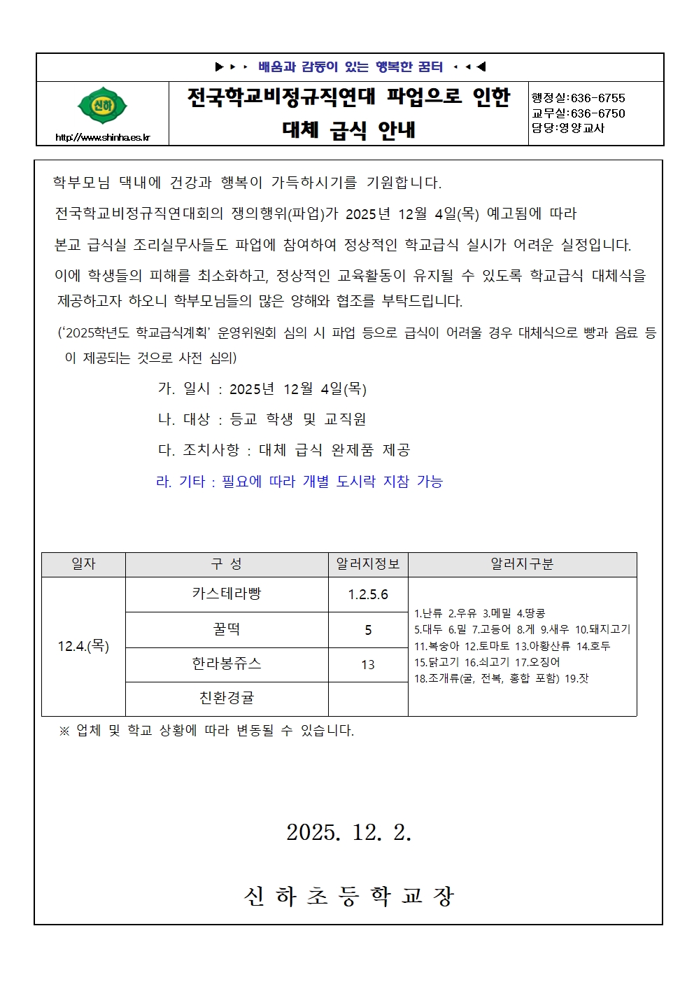 전국학교비정규직연대 파업으로 인한 대체급식안내