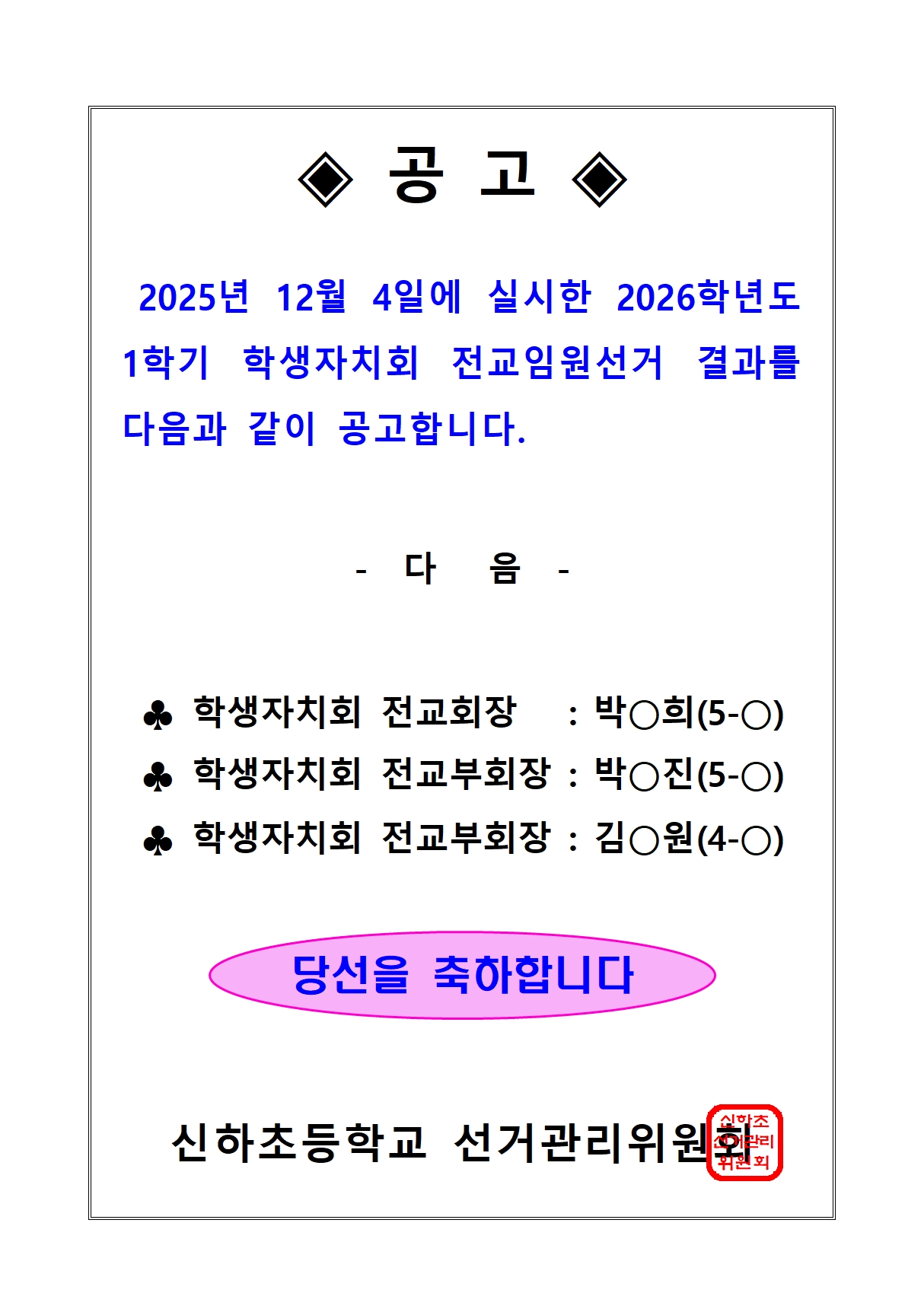 2026학년도 1학기 학생자치회 전교임원 당선자 공고